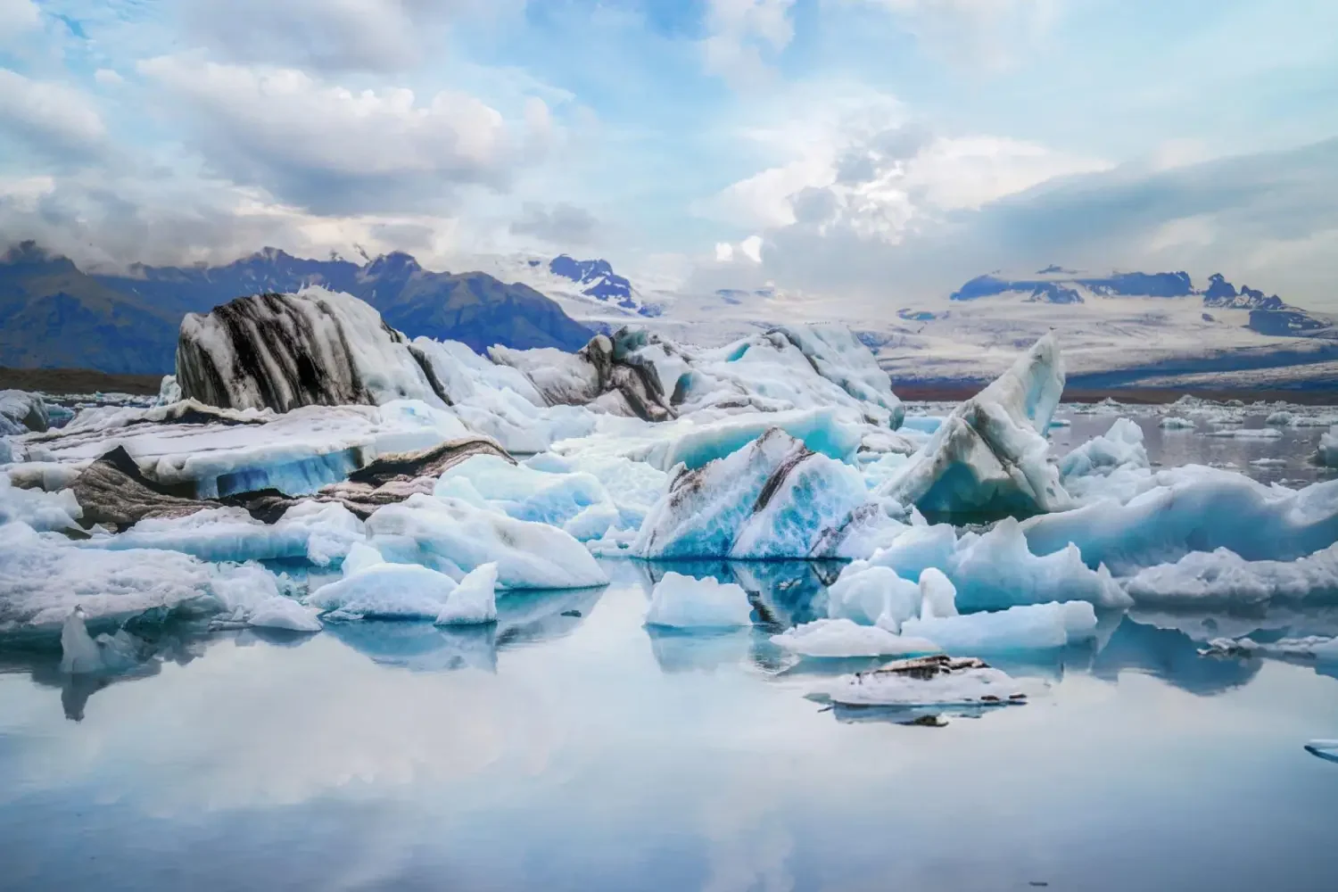 A stunning lake filled with floating icebergs, often visited on South Coast tours.